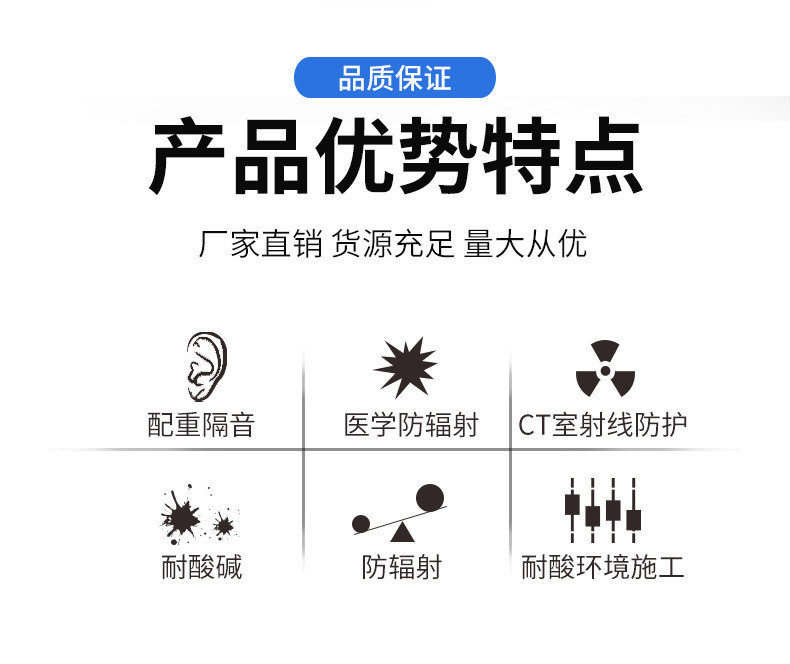 产品特点:具有很强的防腐蚀,耐酸耐碱,耐酸环境施工、医用防辐射,X光,CT室射线防护、加重、隔音等许多方面,而且是一种比较廉价的防辐射材料。