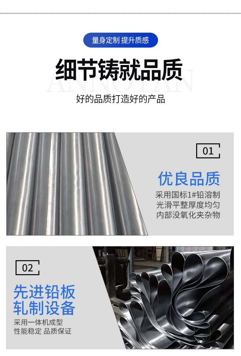 产品简述:铅板,指用金属铅轧制而成的板材,厚度都可定做,一般厚度为1-20mm,常用规格为1000*2000MM,我厂的机器可制作最宽1500MM,最长8000MM,都是采用1#纯铅锭制作,市面上有采用回收铅制作而成的。其品质略差些,价格相差些许。